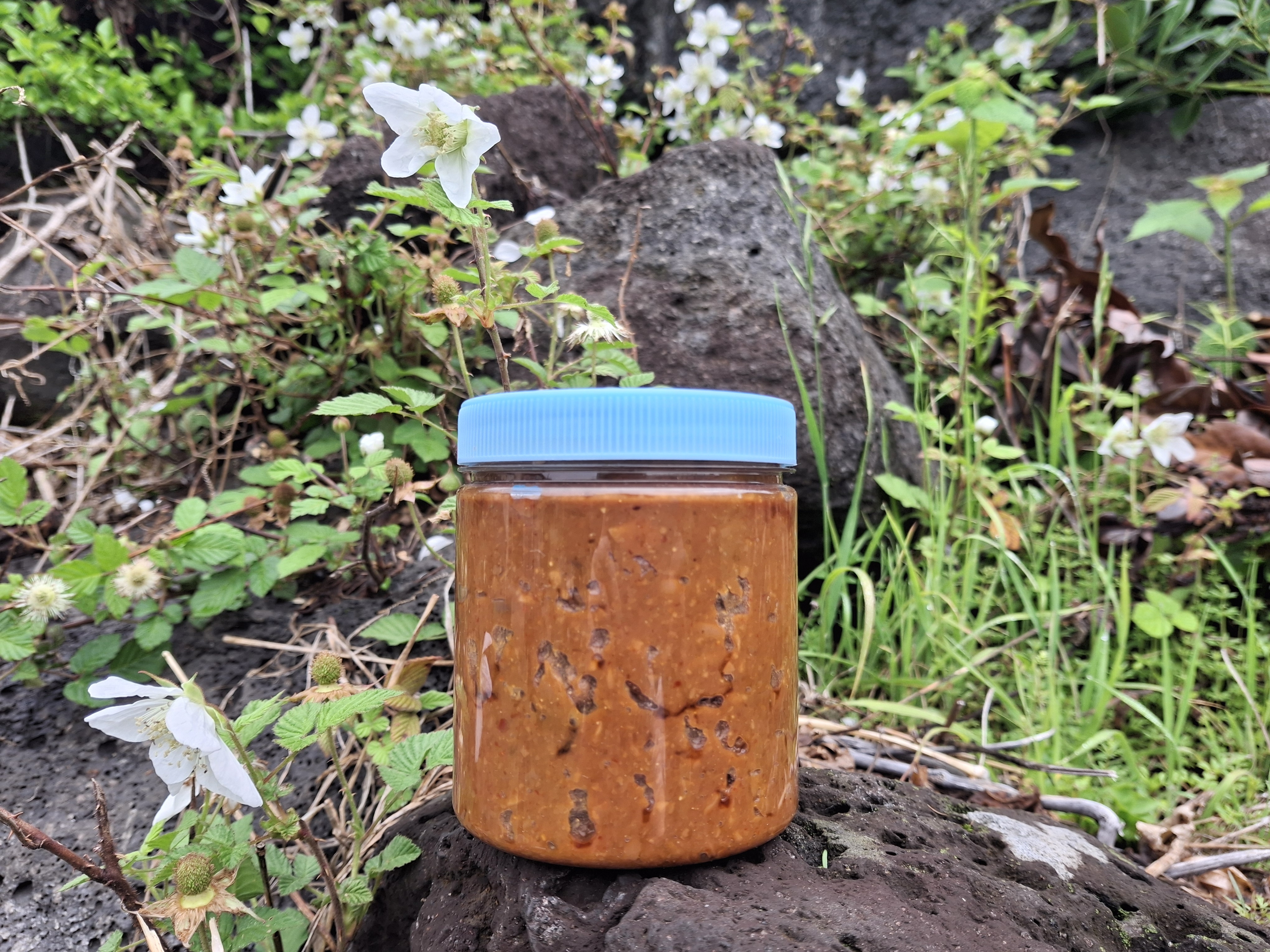 서귀포시 상예동 콩밭은 중산간로 북쪽이라 춥고 바람도 많아요. 우리가 콩을 심기 시작한 2022년 후로는 무제초, 무농약, 무비료 농사를 짓고 있어요. 2025년 연말에 수확한 제주 토종 푸른독새기콩으로 2026년 초에 막된장을 담았어요. 제주도에서는 메주를 띄우지 않고 겨울에 막된장을 만들어서 그 해 장마가 지나면 먹기 시작해요.