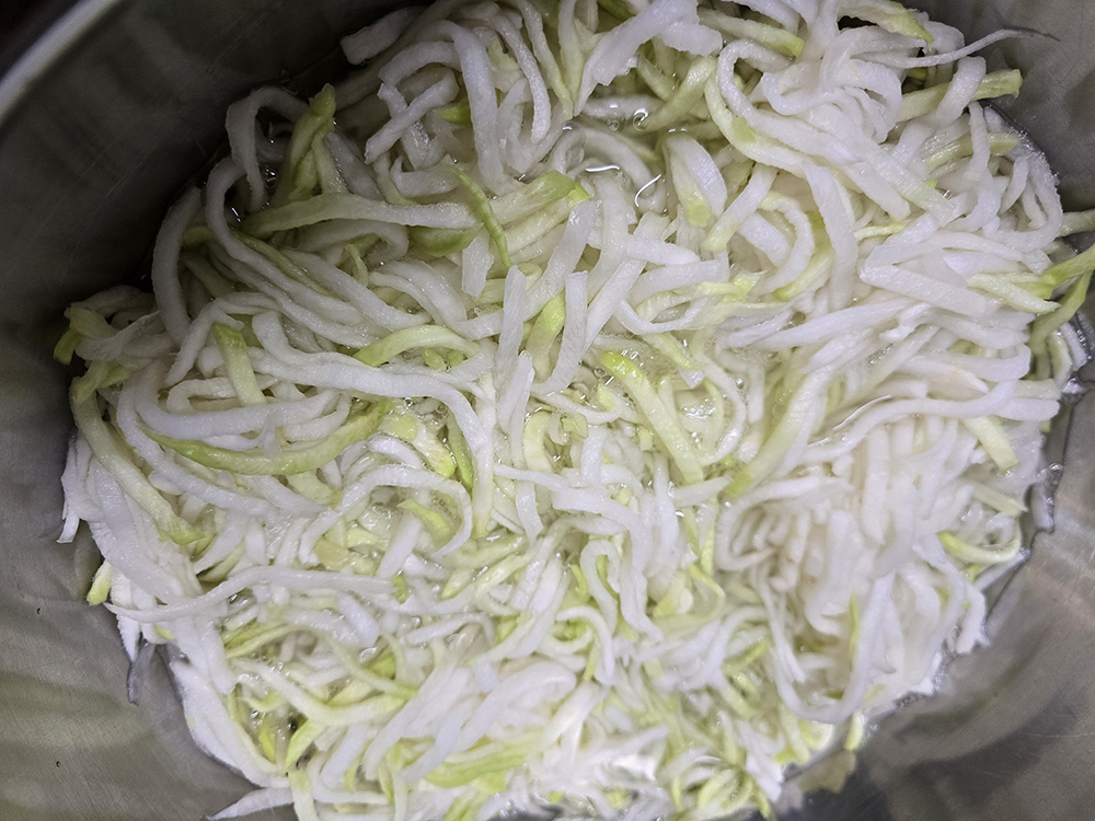 무를 유기농 설탕에 절여서 수분을 제거하고 꼬들꼬들 단무지로 만들었습니다. 물에 유기농 설탕, 간수 빼둔 천일염, 국산 치자 열매를 넣고 끓인 다음 국산원료의 현미식초를 넣고 무채에 부어줬습니다. 많이 달거나 시지않은 단무지입니다.