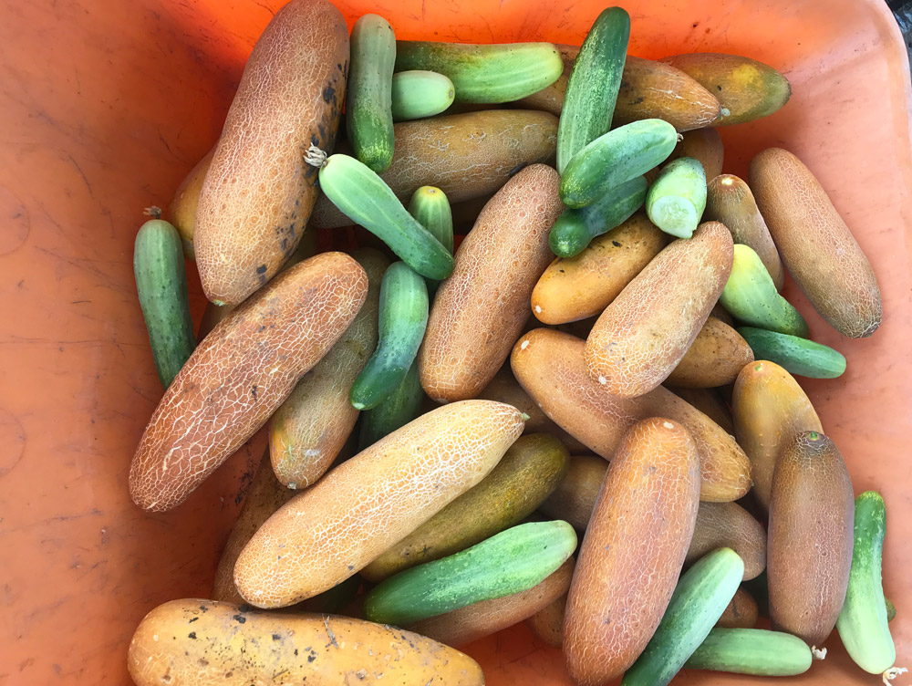 GMO 종자가 아닌 재연 언니가 직접 농사지어 채종한 씨앗을 다시 심어서 키워낸 토종오이랍니다. 모종을 키워서 5월초부터 풀섭을 해치고 자연 재배 방법으로 심어줍니다. 따로 제초제나 화학비료 없이 겨울 동안 음식물 부산물 녹비를 넣어 땅을 부드럽고 기름지게 준비하고 무경운으로 농사하고 살충제는 유황액비 호두와 은행 발효액 자닮오일 등을 사용합니다.
