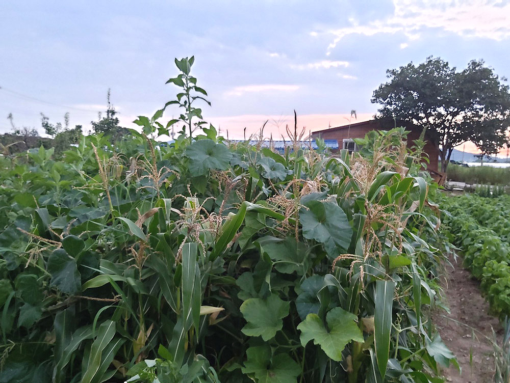 전여농에서 추구하는 농생태학 실천 차원에서 키가 큰 토종검은찰옥수수와 함께 바닥으로 기는 토종 맷돌호박을 섞어 심어 사이좋게 자랐어요.