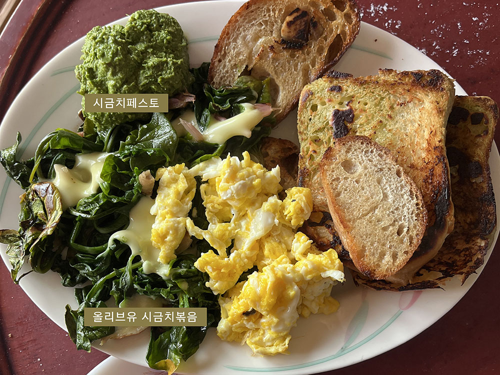 시금치는 나물로 무쳤을 때 그 본연의 맛이 가장 빛난다고 생각해요. 저는 시금치 특유의 은은한 향과 단맛을 온전히 즐기기 위해 소금과 참기름만 살짝 넣어 무쳐먹습니다. 이렇게 무친 나물은 그대로도 훌륭하지만, 파스타나 볶음 요리, 심지어 빵 속 재료로 넣어도 다른 식재료와 놀라울 만큼 잘 어우러지거든요. 조금 더 특별하게 즐기고 싶을 땐 마늘, 견과류, 올리브오일을 넣어 '시금치 페스토'를 만들어보세요. 찐 감자나 토란 뿐만 아니라 빵에 찍어먹어도 환상적인 맛을 자랑합니다. 페스토는 냉동 보관도 가능하니 사계절 내내 꺼내 드실 수 있어요.