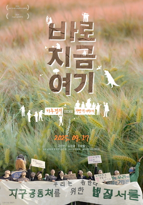 - 제목: 바로 지금 여기 - 장르: 다큐멘터리 - 러닝타임: 94분 / 12세 이상 관람가 - 주연: 강은빈, 김정열, 조분돌 - 감독: 남태제, 문정현, 김진열 - 제작: 공생공락 - 배급: 미디어나무(주) - 줄거리 : 석탄발전소를 수출하는 기업 본사에서 시위를 벌였다는 이유로 기소되어 법정 투쟁을 시작한 은빈은 법정에서 기후위기의 절박함과 민중들이 겪는 기후재난 이야기를 시작한다. 은빈의 이야기는 쪽방촌과 농촌의 기후재난 현장으로 이어지고, 기후재난의 현실 속에서 돌봄과 공동체의 힘으로 삶을 지켜 나가는 민중들의 이야기가 펼쳐진다. 청년 은빈은 치열한 싸움 속에서 대법원 선고를 맞이한다.