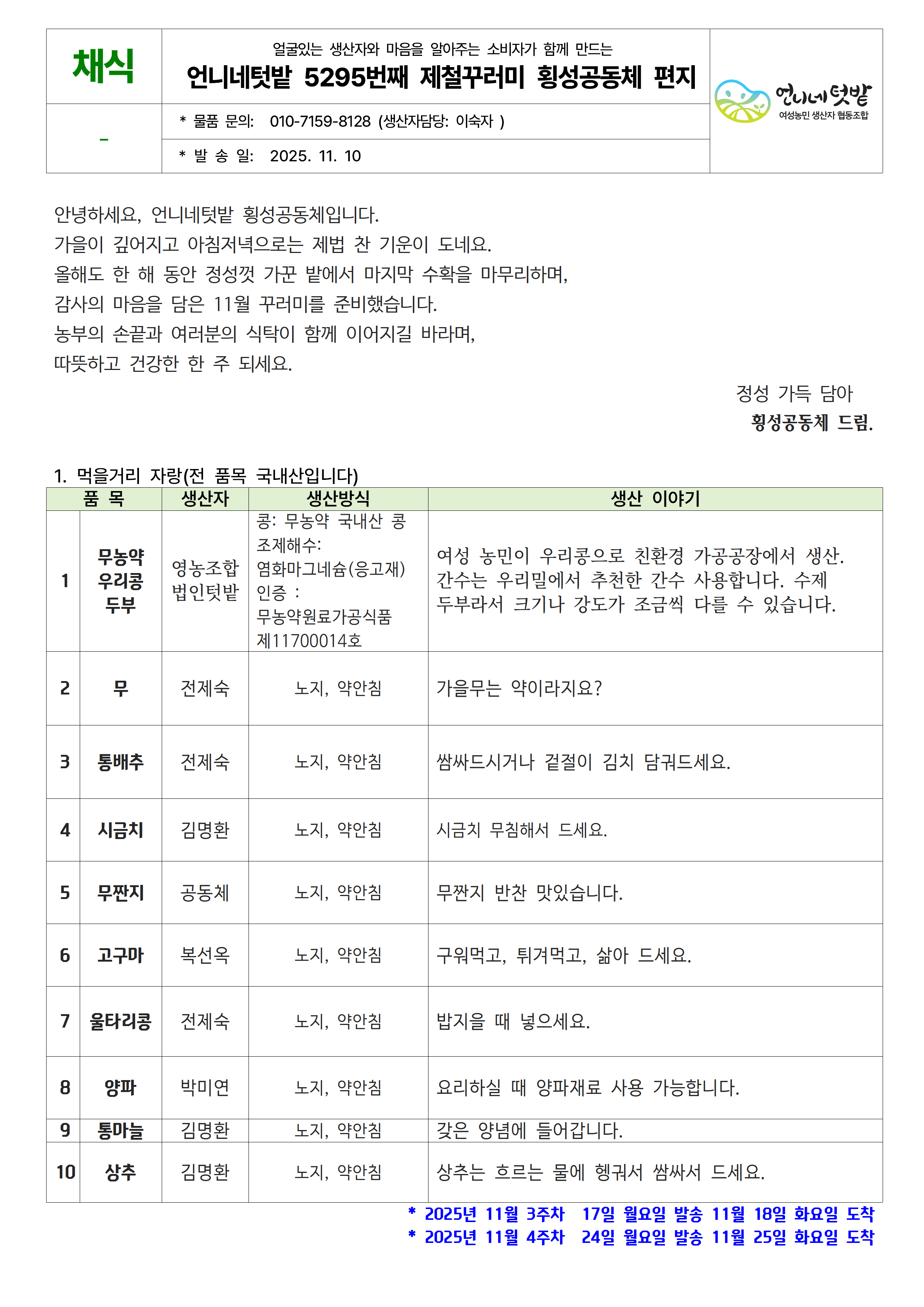 금주 발송 물품 : 무농약우리콩두부, 무, 배추, 시금치, 무우짠지무침, 고구마, 울타리콩, 양파, 통마늘, 상추
