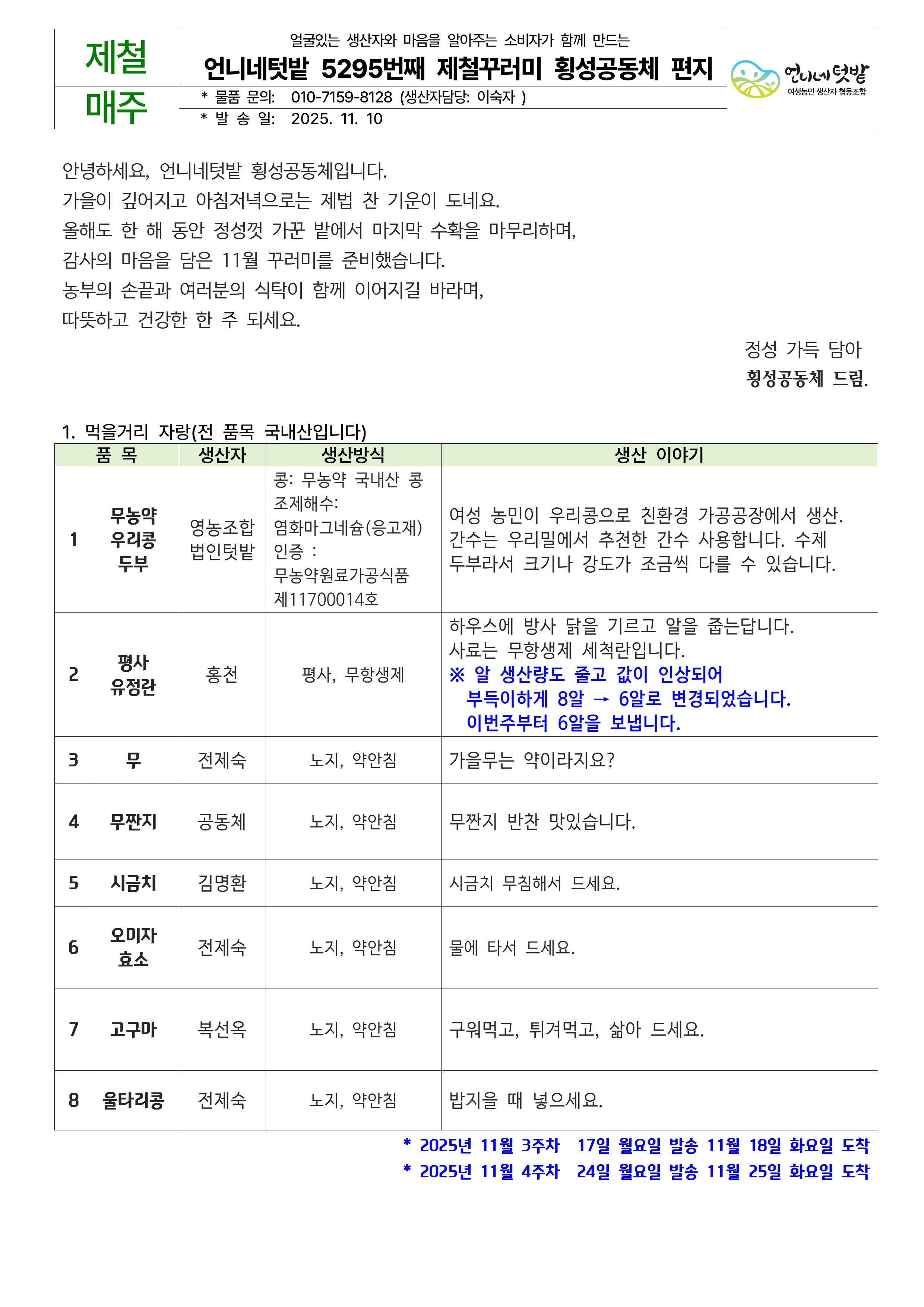 금주 발송 물품 : 무농약우리콩두부, 평사유정란, 무, 무우짠지무침, 시금치, 효소, 고구마, 울타리콩