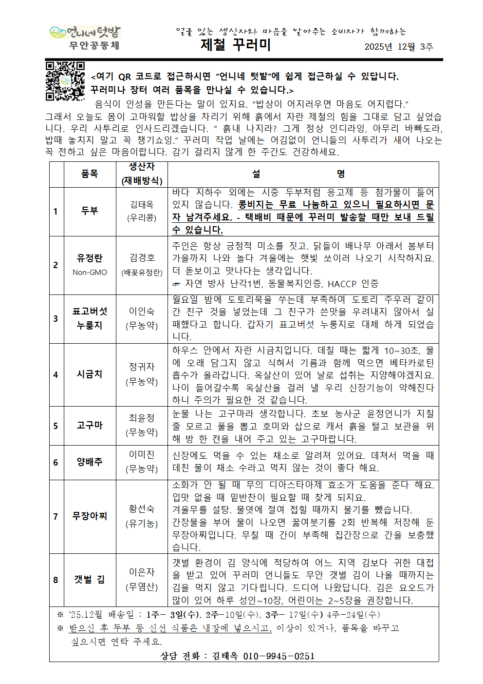 금주 발송 물품 : 우리콩두부, 방사유정란(non-gmo), 도토리묵, 시금치, 고구마, 양배추, 무장아찌, 무안갯벌김
