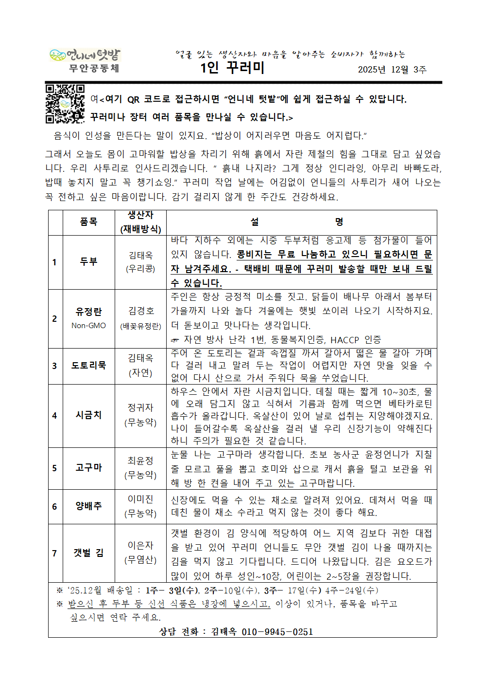 금주 발송 물품 : 우리콩두부, 방사유정란(non-gmo), 도토리묵, 시금치, 고구마, 양배추, 무안갯벌김
