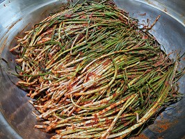 지고추는 인위적인 매운 맛이 아니라 건강한 매운 맛으로 예전방식으로 매운고추를 삭혀서 다져소를 만들어 넣어 양념한것으로 칼칼하고 개운한 맛을 내줍니다.