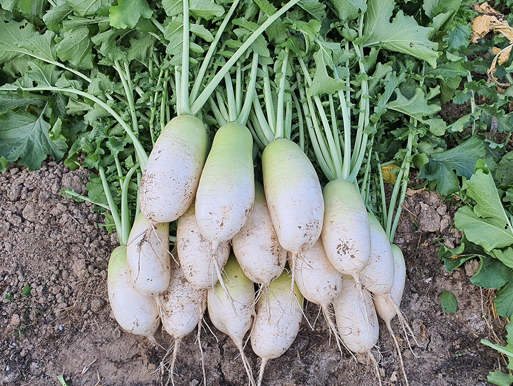 무 품종은 농협 장군무입니다. 무 파종은 멀칭 없이 줄뿌림으로 하기 때문에 제초제는 사용할 수 없답니다. 2~3번의 김매기로 풀을 제거합니다. 배추에 비해 해충피해가 적고 성장이 순조로워 물이 모자란 것만 대비하면 된답니다.
