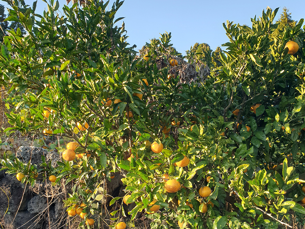 밭 중간으로 비가 많이 올 때면 빗물이 흐르는 밭이지만, 물이 잘 빠지는 것으로 보아 지반이 화산 자갈로 이루어진 밭으로 보입니다. 바람이 많은 지역으로 귤들이 부딪히며 바람의 흔적이 남아있습니다.