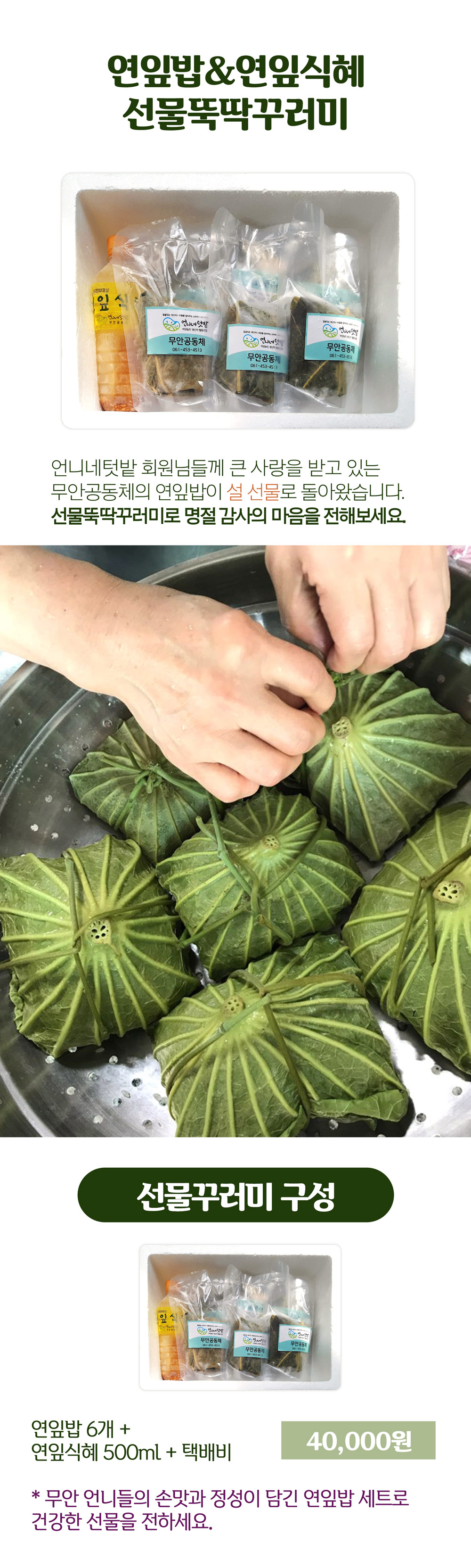 무안공동체 언니들이 설 선물로 연잎밥 6개과 연잎 식혜 1개 세트를 준비했습니다. 선물용으로도 좋고, 오래 두고 드실 용도로 주문하셔도 좋습니다. 한정수량 100개 세트라, 재고소진시 품절됩니다.