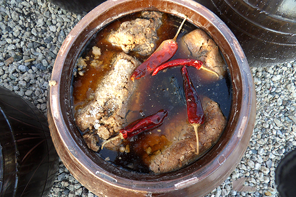 4. 메주가 소금물에 잠길 정도로 소금물을 부어주고, 잡균을 없애기 위해 술과 고추를 띄우고 햇빛이 잘 들 수 있도록 유리뚜껑을 덮어줍니다. 소금물의 농도는 달걀을 넣어 표면이 500원 동전 크기만큼 나오게 되면 적당합니다.