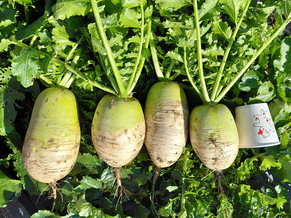 평소보다 늦게 씨를 넣어서 전체적으로 예년보다 작은 것들이 많습니다. 동치미하기에 딱 좋을 듯 합니다.
