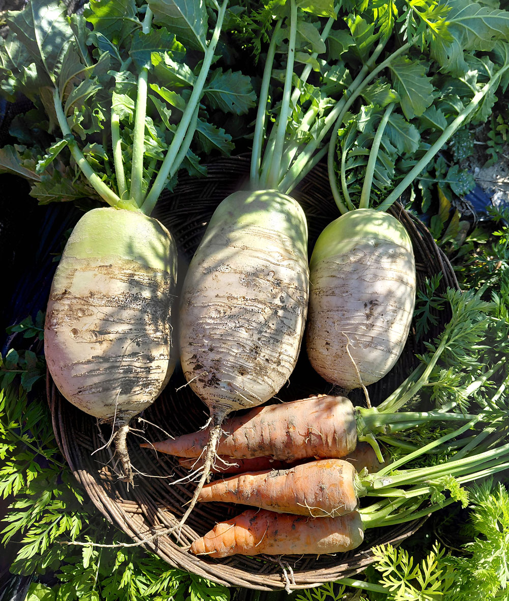 노지에서 밤에는 찬서리를 맞고 낮에는 기온이 높으니 무가 단단하면서도 즙이 많고 시원한 무맛이 제대로 들었습니다.
