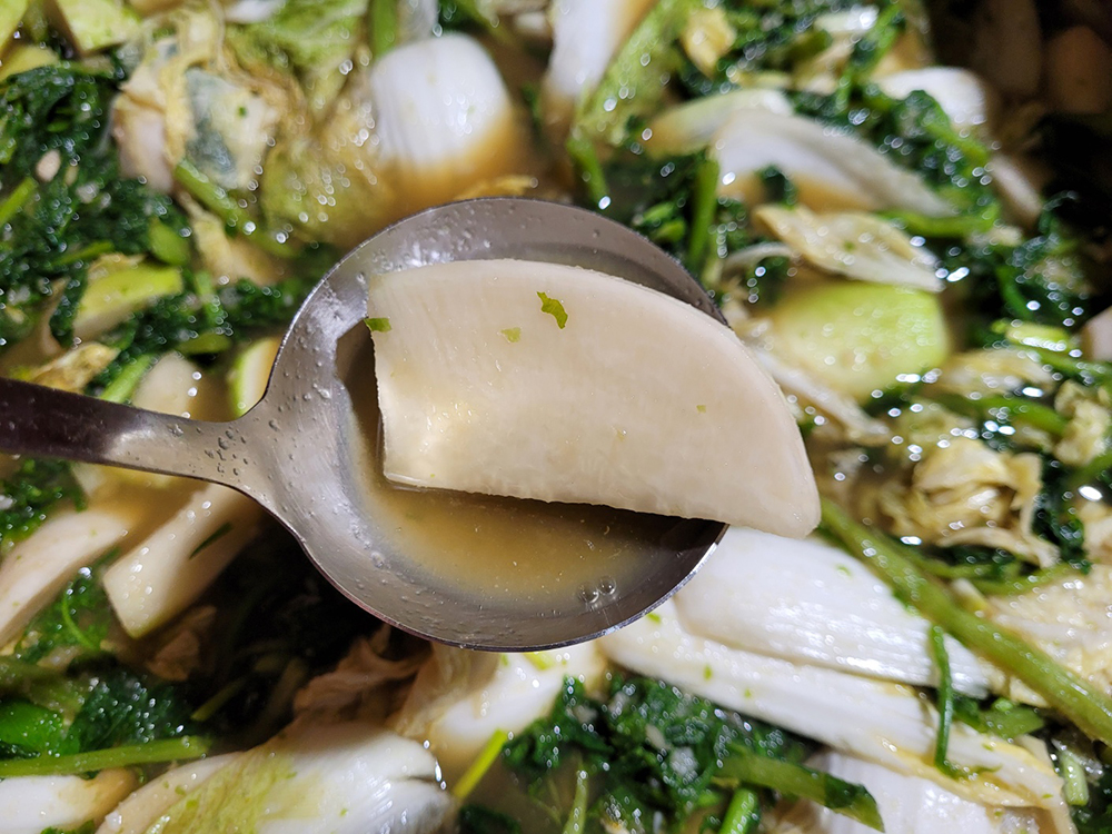 직접 재배한 신선한 겨울 무를 이용해 담은 시원하고 아삭한 무 물 김치입니다