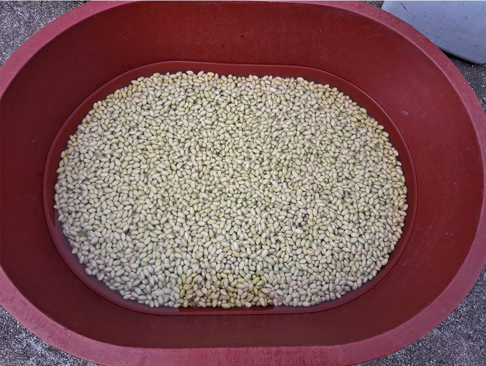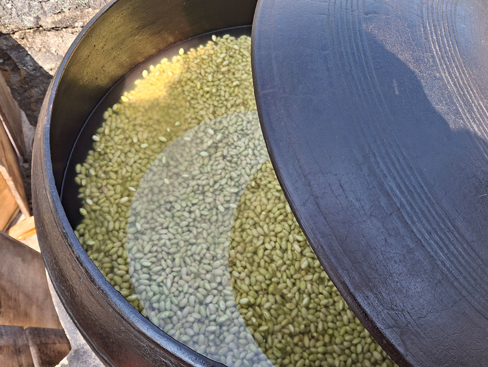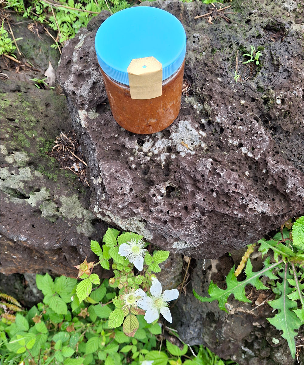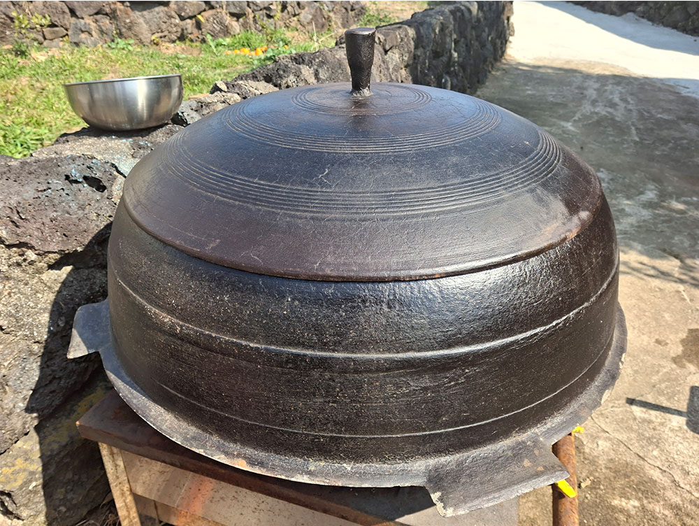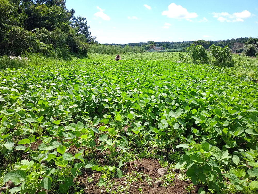 서귀포시 상예동 콩밭은 중산간로 북쪽이라 춥고 바람도 많아요. 우리가 콩을 심기 시작한 2022년 후로는 무제초, 무농약, 무비료 농사를 짓고 있어요. 2025년 연말에 수확한 제주 토종 푸른독새기콩으로 2026년 초에 막된장을 담았어요. 제주도에서는 메주를 띄우지 않고 겨울에 막된장을 만들어서 그 해 장마가 지나면 먹기 시작해요.