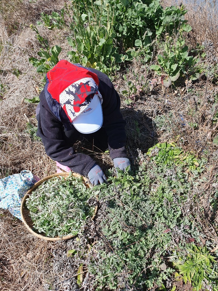꾸러미에 넣을 쑥개떡을 만들기위해 쑥캐기에 여념이 없는 언니, 누구실까요~?