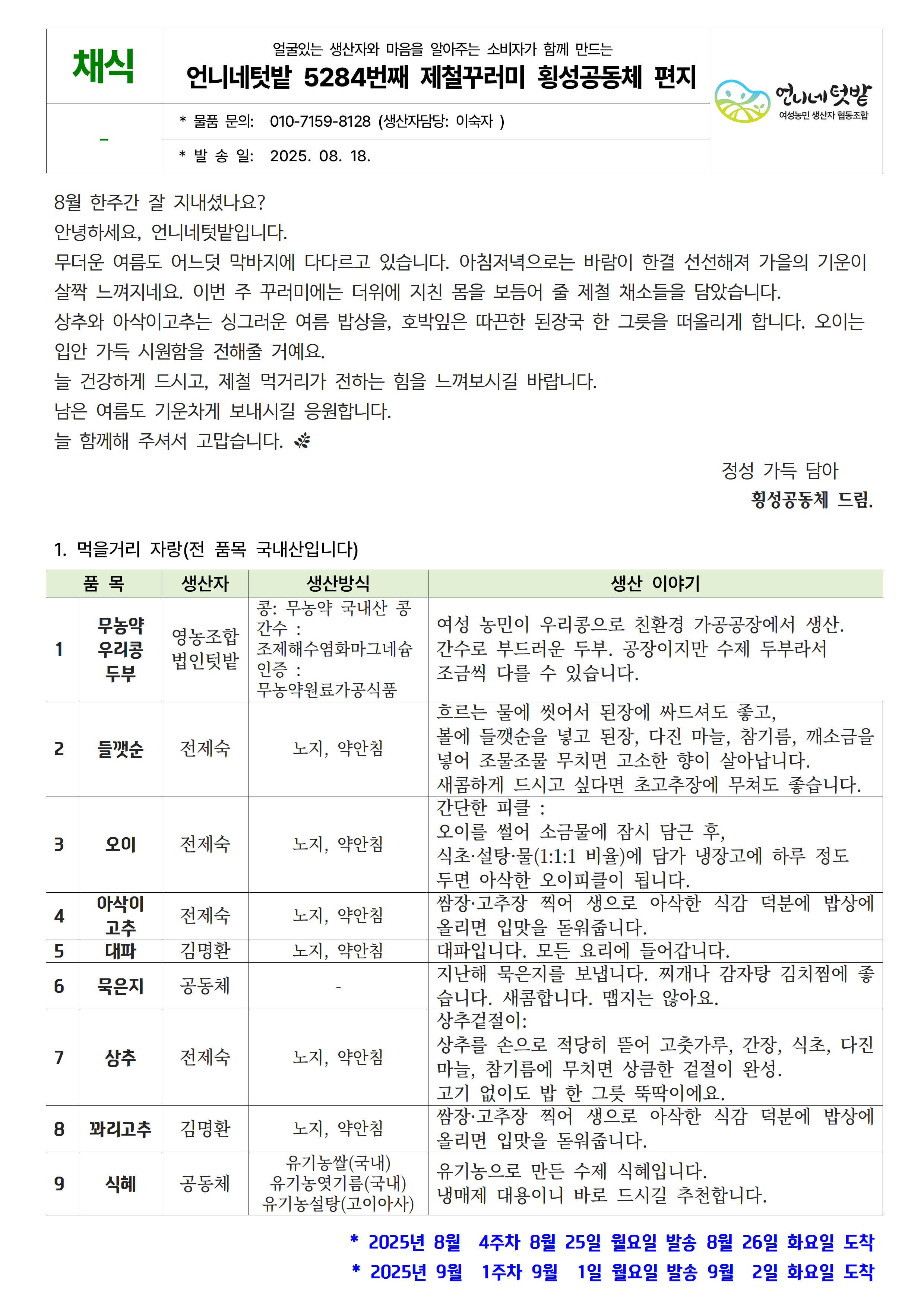 금주 발송 물품 : 우리콩두부, 들깻잎, 오이, 아삭이고추, 대파, 묵은지, 상추, 꽈리고추, 식혜