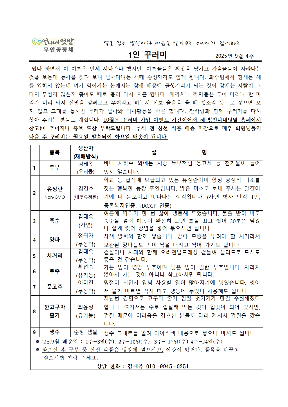 금주 발송 물품 : 우리콩두부, 방사유정란(non-gmo), 죽순, 양파, 치커리, 부추, 풋고추, 깐고구마줄기