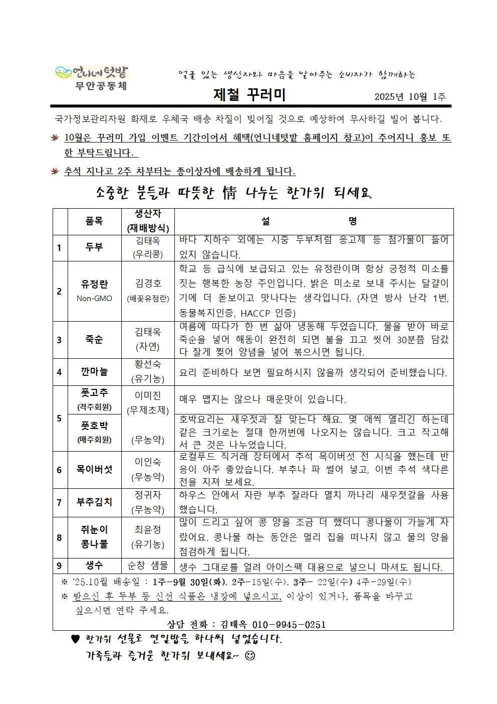 금주 발송 물품 : 우리콩두부, 방사유정란(non-gmo), 죽순, 부추김치, 목이버섯, 쥐눈이콩나물, 깐마늘, 풋고추