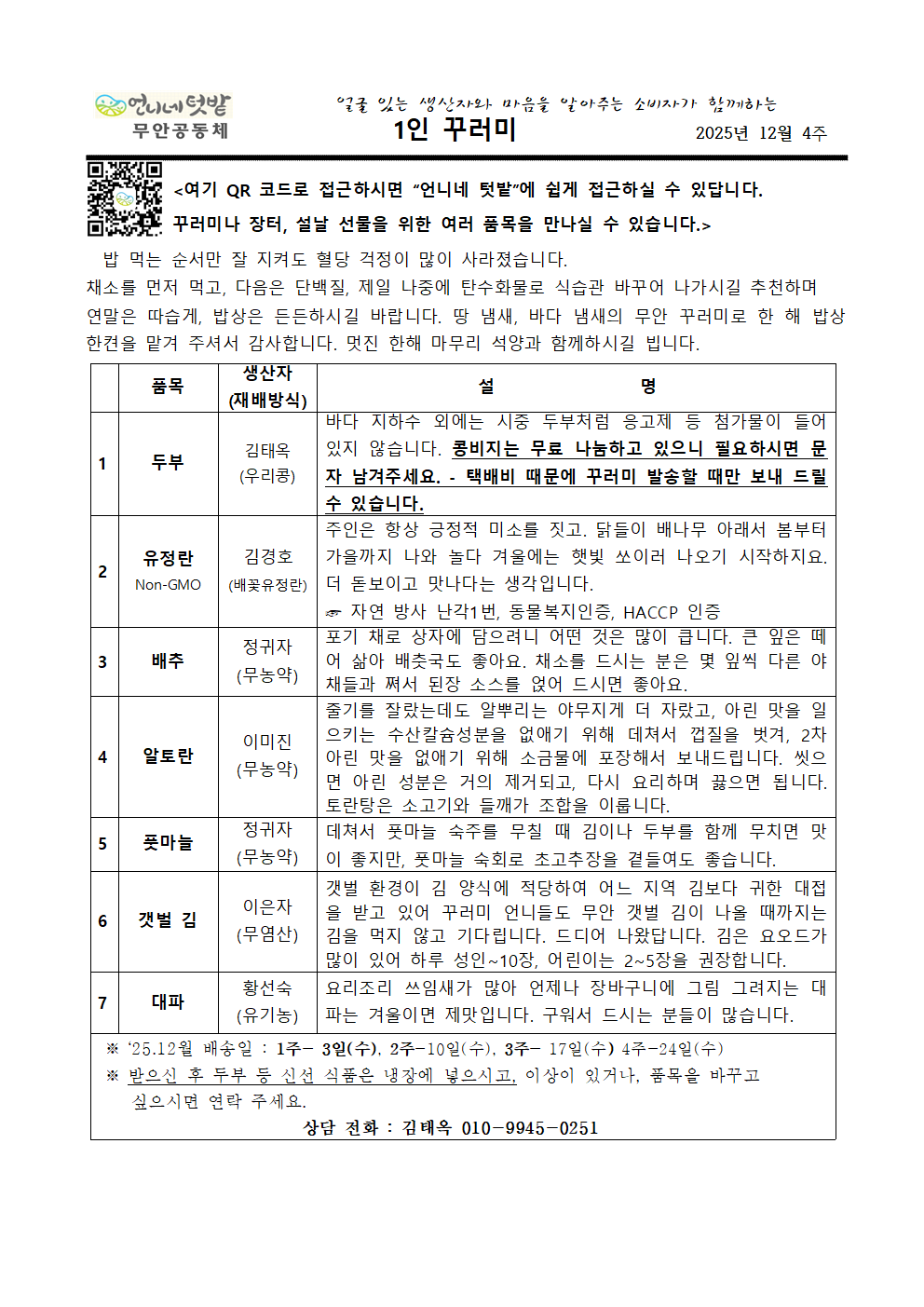 금주 발송 물품 : 우리콩두부, 방사유정란(non-gmo), 배추, 알토란, 풋마늘, 대파, 무안갯벌김